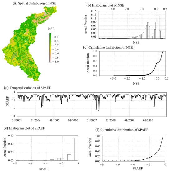 Spatiotemporal and temporospatial and model performance represented by (a) the spatial distribution of the NSE and (b,c) the histogram and cumulative plots of NSE, (d) the temporal variation of SPAEF, (e,f) the histogram and cumulative plots of SPAEF. The ideal value of NSE and SPAEF is 1.