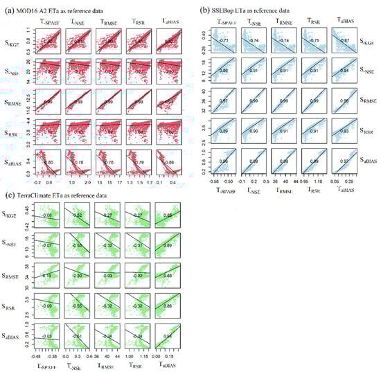 Figure 5 shows that the relation between spatiotemporal (ST) and temporospatial (TS) model performance varies depending on the reference ETa data and the statistical indices used for evaluation. For example, when KGE and SPAEF were used to derive the spatiotemporal (S-KGE) and temporospatial (T-SPAEF) mode of performance statistics, S-KGE and T-SPAEF could be highly positively correlated (Figure 5a), highly negatively correlated (Figure 5b), or uncorrelated (Figure 5c). A high positive correlation between S-KGE and T-SPAEF indicates that an increase in the spatiotemporal model performance will likely lead to an increase in temporospatial model performance. However, a high negative correlation between S-KGE and T-SPAEF means that an increase in spatiotemporal model performance will likely result in a decrease in temporospatial model performance and vice versa. An uncorrelated S-KGE and T-SPAEF indicates that the spatiotemporal model performance cannot be inferred from the temporospatial model performance and vice versa. The results show that even if the same statistical index was used for spatiotemporal and temporospatial model evaluation (e.g., S-NSE and T-NSE, Figure 5a) it does not always guarantee that an increase in the spatiotemporal model performance will lead to an increase in the temporospatial model performance (Figure 5a–c). Overall, the results show that both spatiotemporal and temporospatial model performance evaluation is needed.
