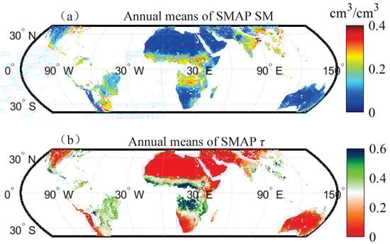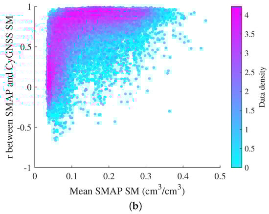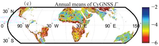 Annual means of: (a) SMAP SM and (b) , and (c) CyGNSS in log-scale.