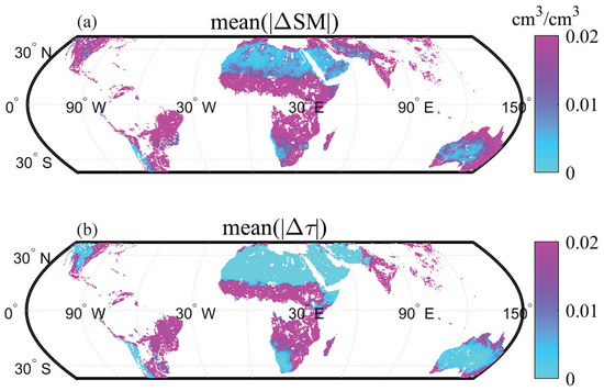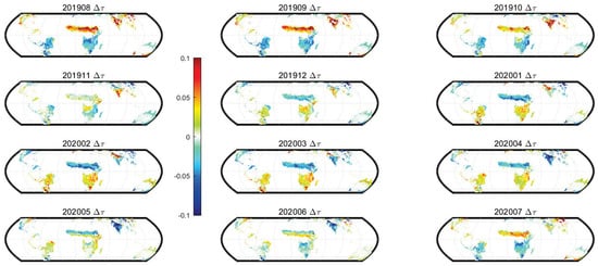 Here, , SM, and are aggregated on a monthly basis. It is widely accepted that monthly SM data are also critical inputs to climate change study and environment research. Although SM data with better spatio-temporal resolutions are also useful and can be achieved by CyGNSS data, the focus of this work is to prove the necessity of including VOD in the retrieval model. In addition, aggregating data monthly can secure the spatial coverage in the EASE-Grid that can facilitate the training phase (with more valid and consecutive data at each grid). More importantly, the averaging process can help improve the data quality of CyGNSS in SM sensing [25]. Then, the monthly averaged , SM, and are subtracted by their corresponding annual mean values (i.e., Figure 1) to determine the variation of each variable. The variation results are exhibited in Figure 3, Figure 4 and Figure 5 and used as the training set.