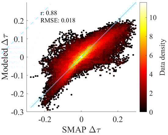 To determine the simulated , a least-squares fitting was performed to derive these unknowns in Equation (5) using the training data and this model was assessed with both the training and test sets. Through evaluation, an r of 0.88 and an RMSE of 0.018 between and were estimated, with the density plot being displayed in Figure 6.