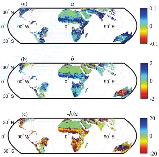 An obvious correlation between the presented and can be well identified by visually comparing the corresponding sub-figures in Figure 4 and Figure 5. The correlation coefficient (r) between the time-series of these two variables was computed, and the outcomes are displayed in Figure 7, from which a strong and positive correlation can be obtained for most of the areas. Such correlation between and confirmed the validity of the adopted BR model. It was also noticed that and were related to some extent. As a result, and appeared to be positively related. However, should be inversely proportional to , as verified subsequently based on the values of coefficients a and b in Equation (3). Through implementing a BR using the , , and data, values of a, b, and c were determined and taken as LUTs. Regions with three or less collocated measurements were rejected in this work. Coefficients a and b illustrated in Figure 8a,b are dominated by positive values, which indicates is generally proportional to both and ; while and are linked by the coefficient , which appears mostly as negative values in Figure 8c. It can be noted that the regions with problematic coefficients coincide with a low correlation coefficient r in Figure 7, e.g., in northwest Australia. Through analyses, it was found that those places are characterized by extremely low and/or invariant SM/ (refer to Figure 1b,c for low SM/ and Figure 9 for / values). In addition, by referring to the land cover classification provided in the SMAP dataset (see Figure 10), these regions are typically barren, sparsely vegetated, or they have open shrublands. Furthermore, mean values of SM, VOD, and Coefficients a, b, and c (, , , , and ) for the dominant land cover type with more than 100 pixels over the globe are calculated and presented in the ascending order of in Table 1. It can be noticed that , , , and are roughly proportional to each other, while they are inversely proportional . It can be interpreted that for regions with higher , is generally higher, and more importantly, the sensitivity of CyGNSS to SM is stronger because increases. Moreover, the changing trends of and are not monotonical, respectively showing a dig and pump for cropland/natural vegetation mosaic, which proves the response of CyGNSS to VOD as well. Thus, it can be summarized that CyGNSS can be linked with SM and VOD, which further validates the rationality of this proposed model.