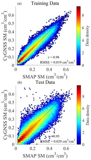 Density plot comparing the retrieved and SMAP SMs: (a) Training and (b) test data.