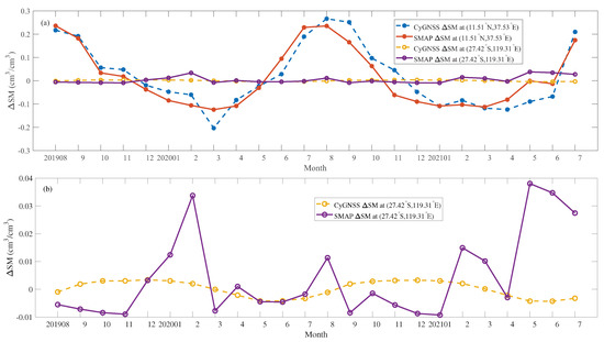 Time-series of retrieved and referenced at: (a) (11.51°N, 37.53°E) (East Africa, marked by astride) and (27.42°S, 119.31°E) (West Australia, represented by circle) and (b) zoomed in for West Australia. The corresponding locations are also labeled in Figure 10.