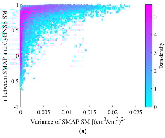 Through examining both the 1-year long training and test data, a good agreement was found between the retrieved and reference SMs, and the density plots are shown in Figure 11. The obtained r is up to 0.98 for the training data. The use of facilitates the targeting of the desired value. Still, without including , satisfactory consistency between the estimated and reference was reached, with an r of 0.91 and a root-mean-square error (RMSE) of 0.019 cm/cm. The good correlations between the derived product and the SMAP SM product can be due to their consideration of VOD. Statistical results with more details are listed in Table 2 for both training and test data. Negligible degradation of accuracy in the test dataset compared with that for the training set proved the generalization of this method. Figure 12 demonstrated the time-series of two locations that are respectively marked by a red astride (11.51°N, 37.53°E) and a red circle (27.42°S, 119.31°E) in Figure 10. The former is characterized by good alignment between both results and shows a clear seasonal cycle. Conversely, the latter represents a typical example with low correlation between two products. Moreover, corresponding SMs are relatively low and stable without distinct seasonal patterns. To support this argument, the impacts of mean and variance of SM on the retrieval results in terms of r were evaluated. It was confirmed that SMs with low annual average and variation were typically accompanied with higher discrepancy between two SM products and vice versa (see Figure 13).