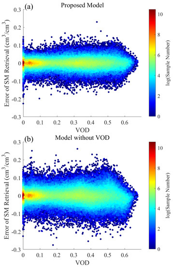 Density plot showing retrieval errors with (a) and without (b) considering VOD in the retrieval model.