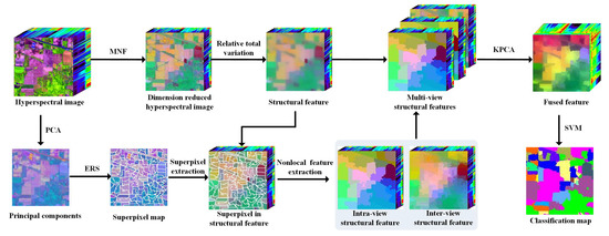 The hyperspectral feature extraction technique is one of the most popular topics in the remote sensing community. However, most hyperspectral feature extraction methods are based on region-based local information descriptors while neglecting the correlation and dependencies of different homogeneous regions. To alleviate this issue, this paper proposes a multi-view structural feature extraction method to furnish a complete characterization for spectral–spatial structures of different objects, which mainly is made up of the following key steps. First, the spectral number of the original image is reduced with the minimum noise fraction (MNF) method, and a relative total variation is exploited to extract the local structural feature from the dimension reduced data. Then, with the help of a superpixel segmentation technique, the nonlocal structural features from intra-view and inter-view are constructed by considering the intra- and inter-similarities of superpixels. Finally, the local and nonlocal structural features are merged together to form the final image features for classification. Experiments on several real hyperspectral datasets indicate that the proposed method outperforms other state-of-the-art classification methods in terms of visual performance and objective results, especially when the number of training set is limited.