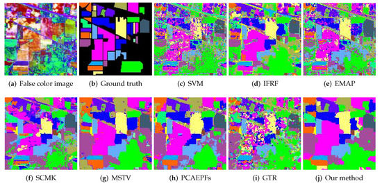 Classification results of all considered approaches on Indian Pines dataset. (a) False color image. (b) Ground truth. (c) SVM [33], OA = 55.30%. (d) IFRF [14], OA = 70.09%. (e) EMAP [13], OA = 67.70%. (f) SCMK [39], OA = 71.20%. (g) MSTV [15], OA = 88.25%. (h) PCAEPFs [8], OA = 85.58%. (i) GTR [40], OA = 63.25%. (j) Our method, OA = 90.32%.