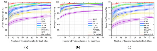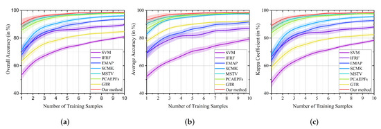 Classification performance of different approaches on the Salinas with different numbers of training samples. (a) OA. (b) AA. (c) Kappa. The widths of the line areas are the standard deviation of accuracies produced in ten experiments.