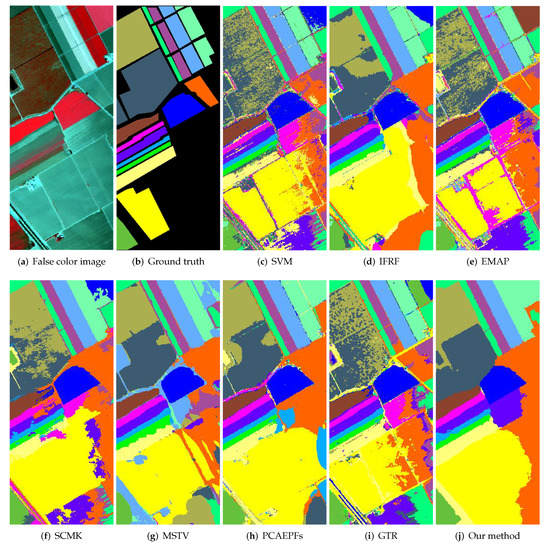 The third experiment is performed on a complex crop scene with 22 crop classes, i.e., Honghu dataset, in which the benchmark training and test samples (http://rsidea.whu.edu.cn/e-resource_WHUHi_sharing.htm (accessed on on Jaunary 2022)) are adopted. The classification results of all methods are shown in Figure 9. Similarly, the SVM method produces a very noisy visual map since only the spectral information is used. The IFRF method greatly improves this problem by using the image filtering on the raw data, obtaining a better classification result over the SVM method. The EMAP method also obtains a noisy classification map. The reason is that this feature extraction method is in a pixel-wise pattern. For the SCMK method, the classification map has a small amount of misclassification labels for some classes. The MSTV method obtains a better classification map due to multi-scale technique. However, the edges of different classes still have misclassification appearance. The PCAEPFs method yields a similar classification effect to the MSTV method. For the GTR method, the classification result suffers from serious misclassification for this complex scene when the amount of training set is limited. By contrast, the proposed method yields the best visual map with respect to other studied approaches, since multi-view structural features are effectively merged to yield a complete characterization of different objects.
