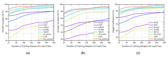 Furthermore, Table 3 also verifies the effectiveness of the proposed method. Likewise, the proposed method obtains the highest classification accuracies with regard to OA, AA, and Kappa compared to other studied techniques. In addition, the influence of different numbers of training samples is presented in Figure 8. The number of training set for each class is varying from 5 to 50. It is shown that the increase of the training size is beneficial to the classification performance of all methods. Moreover, our method is always higher than other classification approaches.