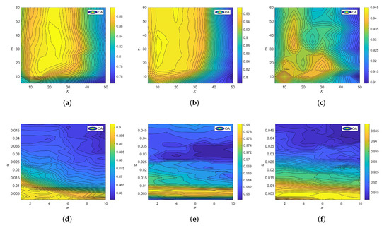 The influence of different parameters in the proposed method. The first row is the influence of the number of dimension reduction L and the number of fused feature K. The second row is the influence of the smoothing parameter and the window size . (a) Indian Pines dataset; (b) Salinas dataset; (c) Honghu dataset; (d) Indian Pines dataset; (e) Salinas dataset; (f) Honghu dataset.