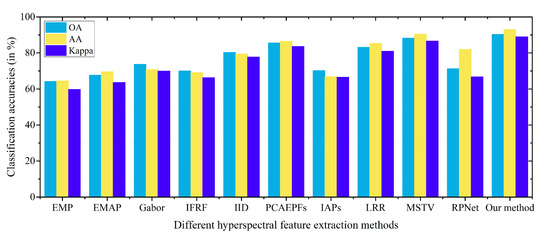 To demonstrate the advantage of the proposed feature extraction method, several widely used feature extraction methods for HSIs are selected as competitors, including extended morphological profiles (EMP) [41], extended morphological attribute profiles (EMAP) [13], Gabor filtering (Gabor) [42], image fusion and recursive filtering (IFRF) [14], intrinsic image decomposition (IID) [43], PCA-based edge-preserving filters (PCAEPFs) [8], invariant attribute profiles (IAPs) [44], low rank representation (LRR) [45], multi-scale total variation (MSTV) [15], and random patches network (RPNet) [46]. An experiment is performed on the Indian Pines dataset with 1% of training samples listed in Table 1. The classification accuracy of all considered approaches is shown in Figure 12. The EMP and EMAP methods only yield around 60% classification performance when the number of training samples is scarce. The classification performance obtained by the edge-preserving filtering-based feature extraction methods such as IFRF and PCAEPFs also tends to decrease when the number of training set is scarce. The RPNet-based deep feature extraction method also fails to achieve satisfactory performance. By contrast, it is found that the proposed feature method obtains the highest classification performance among all feature extraction techniques for three indexes, which further illustrates that the proposed method can better characterize the spectral–spatial information compared to other methods by fusing local and nonlocal multi-view structural features.