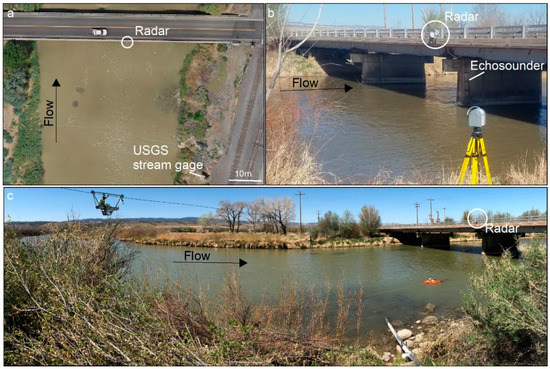 Conventional methods were used to measure velocity, stage, and discharge to assist with siting the radar and assessing the accuracy of radar-based measurements. Cross-sectional channel geometry used to generate the stage–area rating for estimating radar-based discharge was measured using an ADCP at sections that were too deep to wade; these were measured using real-time kinematic global navigation satellite system along shallow sections and dry streambanks in accordance with protocols described by [67]. The cross-section was collected under the radar footprint and is published in [63]. Instantaneous or “site visit” measurements of velocity, stage, and discharge were made using in-stream mechanical current meters or ADCPs [68]. Site visit measurements were accessed using the dataRetrieval package in R [69,70].