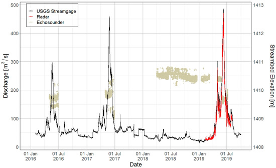 Time series of discharge and streambed elevation datasets collected at the study site. The black line represents discharge estimates generated from conventional methods at the USGS streamgage (09125000), the red line denotes discharge estimates generated from the PC method based on measurements from the radar, and the tan circles denote streambed elevation data collected from the single-beam echosounder. Discharge estimates are in cubic meters per second and correspond with the primary (left-hand) y-axis, whereas streambed elevation data are in meters above NAVD 88 and correspond with the secondary (right-hand) y-axis.