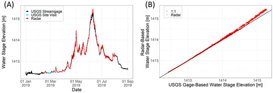 Comparisons of radar-based stage data (red), continuous USGS-streamgage-based stage data (black), and USGS site visit stage data (cyan), that include (A) a time series of all datasets and (B) a scatterplot of radar-based stage data vs. USGS continuous streamgage-based data. Elevation data are in meters above NAVD 88.