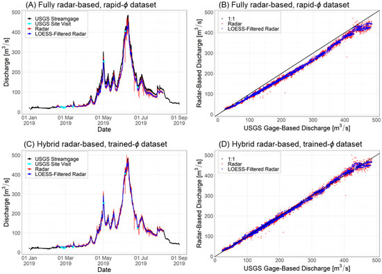 Comparisons of unfiltered (raw) radar-based discharge estimates (red), LOESS-filtered radar-based discharge estimates (royal blue), continuous USGS-streamgage-based discharge estimates (black), and USGS site visit stage discharge measurements (cyan), for the fully radar-based, rapid-ϕ dataset (A,B) and the hybrid-radar-based, trained-ϕ dataset (C,D). These include the time series of both datasets (A,C) and scatterplots of both radar-based discharge datasets versus USGS continuous streamgage-based datasets (B,D).