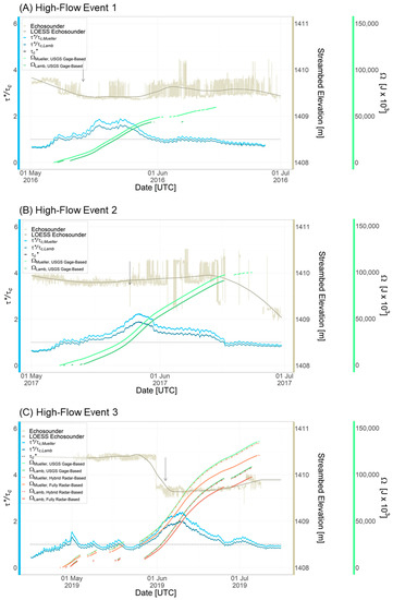 where is water density in kg/m3, g is gravitational acceleration in m/s2, Q is discharge in m3/s, S is the water surface slope in m/m, and B is water surface width in meters [32,33,34,45]. Note that the definition of Ω in this study is consistent with [45,47]; however, others have defined Ω differently as the total stream power equal to (in units of W/m) (e.g., [34]). To calculate ω, Q was derived from both continuous USGS streamgage records collected over the 4-year monitoring period and from (LOESS-filtered) radar-based measurements collected during the last year of monitoring. Slope (S) was estimated from an empirical relation between Q and S measured by [90]. Channel top width (B) was estimated from stage measurements and the stage–width curve, derived from cross-sectional geometry measured at the bridge.