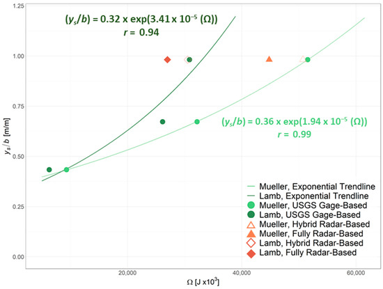 Additionally, Ω estimates varied depending upon the discharge estimate (either radar-based or streamgage-based) used in calculations. Results indicated that Ω values calculated using the hybrid-radar-based discharge estimates were slightly less (PBIAS 0.78–1.24%) than Ω values calculated using USGS-streamgage-based discharge estimates, whereas Ω values calculated using fully radar-based discharge estimates were much less (PBIAS 11.12–32.70%) than Ω values calculated using USGS-streamgage-based discharge estimates (Table 6). Those findings were consistent with results from Section 3.1.2, which showed better agreement between hybrid-radar-based discharge estimates and streamgage-based discharge estimates than between fully radar-based discharge estimates and streamgage-based discharge estimates (Table 4 and Table 6). Despite differences between radar-based and streamgage-based Ω values, the hybrid-radar-based results and fully radar-based results calculated using still exceeded this study’s criteria for satisfactory performance, although fully radar-based results calculated using did not (Table 6).