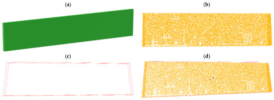 A 3D as-built point cloud acquired through laser scanning is generally dense and accurate; however, it contains noise and outliers which may limit the overall reliability of the registration. Therefore, the point cloud needs to be cleaned completely beforehand through computer algorithms, such as the tensor voting algorithm [,]. Furthermore, as high point densities increase the computation time, it can be necessary to down-sample the point cloud using octree-based voxelization. The voxel size must be chosen in function of the desired level of detail because although the computation time benefits from a larger voxel size, this also causes a loss of detail.
