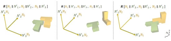 In the case of the occurrence of corresponding combinations with unique angles between their cluster directions, these clusters can automatically be regarded as being the clusters with matching plane segments. In this ideal scenario, the rotation matrix calculated from these corresponding clusters represents the correct orientation of the as-built model with the as-planned model. However, this ideal scenario seldom occurs, as most buildings have an orthogonal geometry with many parallel structural components. This reduces the number of possible distinct angles between plane clusters; hence, the number of possible rotation matrices ( increases substantially. Some rotations resulting from different combinations of the directions of the two models are shown in Figure 6.