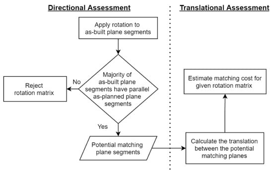 For each rotation matrix, first a preliminary assessment of the directions of the plane segments from both models is performed to either discard the rotation matrix, because it is an unlikely candidate, or to continue by computing the total matching cost based on potential matching planes. The assessment workflow is shown in Figure 8.