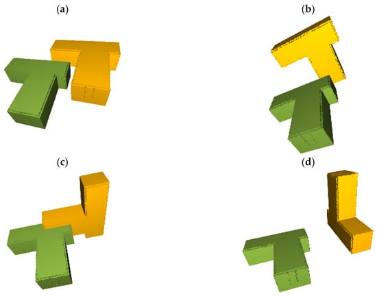 Figure 7 shows a few examples with different orientations of the as-built model relative to the as-planned model to depict how the direction and translation between the matching plane segments can be different if the models are not correctly aligned. Based on this, all the possible rotation matrices are evaluated to identify the rotation matrix offering the most likely alignment. The identification process is performed by assessing the individual plane segments of both models based on their directions and translations for each rotation matrix by computing a matching cost. The details of this calculation are explained below.