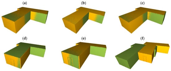 Generally, the building models met these two conditions, and even a scan of a small typical building had plane segments in three distinct directions with a point cloud covering the walls for the most part. In the worst scenario, with a major missing part in the point clouds, the registration can further be improved through ICP registration. Figure 16 shows an example of a modified simulated model of dataset 1 with an as-planned model (Figure 16a) and an as-built model (Figure 16b) with just three plane segments that were successfully registered through the proposed method. In this example, all three plane segments of the as-planned model had different directions and were identical in size to their corresponding segments. Similarly, it is also evident that the proposed method accurately calculated the translation based on matching planes even if the major part of the model was missing, as compared to the traditional technique based on the centroid of whole models, as shown in Figure 16c,d.