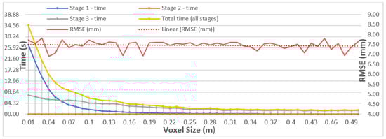 The time efficiency of the proposed technique was analyzed in detail. First, the effect of voxel size on processing time was examined. Generally, a decrease in voxel size increased the size of the point cloud, which in turn increased the processing time. However, an increase in voxel size induces a loss of detail, leading to a possible decrease in the registration accuracy. Hence, a compromise must be found. Therefore, the processing time of the different processing stages (illustrated in Figure 1), as well as the overall registration accuracy, were analyzed with a range of different voxel sizes for dataset S1. The results are shown in Figure 14, where it can be observed that the overall processing time of the method significantly increased once the voxel size was lowered to 0.1m. The time complexity of the proposed technique is  equals the voxel size in a grid. When the computation time was analyzed per processing stage, it was clear that the overall processing time was not affected by stage 2, while the processing time of stage 3 increased approximately linearly with a decreasing voxel size, and the computation time in stage 1 increased significantly once the voxel size dropped under 0.1 m. This major increment in computation can be attributed to the plane segmentation of the as-built point cloud that is performed using RANSAC segmentation, which estimates the plane from the voxelized points in numerous iterations. Therefore, the voxel size should be chosen to be between 0.1 m and 0.5 m to ensure the success of the proposed method and limit the significant increment in processing time.