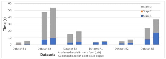 As the proposed method processes the as-planned model from the BIM directly into the triangulated mesh instead of the point cloud, the total processing time of the proposed technique was also analyzed by processing the as-planned model in both triangulated mesh and point cloud form. It was found that extracting the geometric parameters directly from the triangulated mesh of the as-planned model instead of converting it into a point cloud had a positive impact on the overall computation time, as shown in Figure 15. This is due to the fact that the required plane parameters (such as the normal of a plane) can be extracted directly from the mesh model, while in the case of the point cloud, these parameters are calculated from the 3D points of plane segments, which increases the processing time.