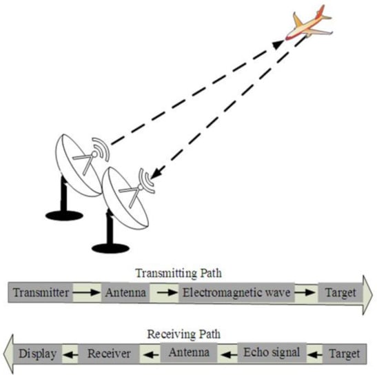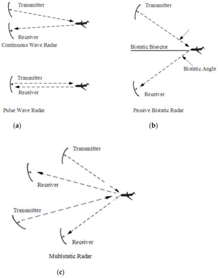 In general, in radar systems, there are a number of transmitter/receiver (antenna) nodes that are designed to make the system operate either as monostatic, bistatic, or multistatic radar. Each radar system depends on the type of waveform, whether continuous or non-continuous (i.e., pulse wave) []. The radar is called monostatic radar if the transmitter and receiver are placed in the same place; otherwise, the radar is a bistatic or multistatic type if both transmitter and receiver(s) are separately located over a distance []. Figure 1 depicts the three types of radar systems.