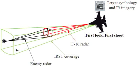 Additionally, the radar systems have also been linked with modern infrared for search and tracking (IRST) systems to provide anti-stealth capabilities in secure communications and the military. The IRST system actively scans the airspace for heat signatures, transmitting its IR emission, and passively detects and tracks the target based on IR emission, allowing the crew to attack without warning the target (i.e., first look then shoot). The IRST21 sensor in the F-14D Tomcat and the IRST in the super Hornet are two examples of current systems that are now in low production and could be operational by 2018, as shown in Figure 3 [,].