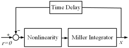 In this study, chaotic behavior in a dynamical system with a single state variable and a minimum number of elements is addressed in detail using a simple time-delay chaotic system in Lur’e form. The Lur’e system consists of three elements, namely time-delay, an integrator, and non-linearity, respectively, as shown in Figure 4. The time-delay affects the dynamic of the systems, such as single state time-delay, which makes the system infinite-dimensional, the integrator officiates the system dynamics of a single state, and the non-linearity is a necessary part and is wanted as a major, so chaos is a distinguishing characteristic of nonlinear systems [,]. Consequently, the dimensionless equation of the Lur’e system can be expressed as follows