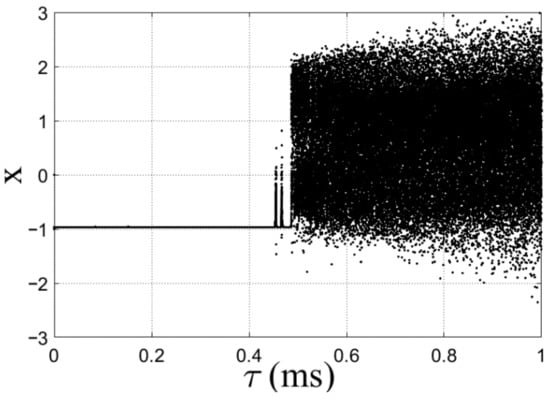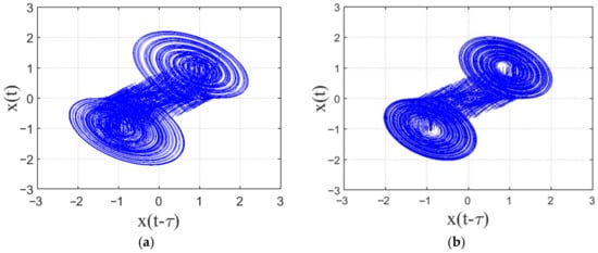 Accordingly, system (1) with the selected parameter values a = 1, b = 2, and k = 1800, and x(0) = −1 can also produce the delay-dependent chaotic attractor with double scrolls at the time delay τ* ≥ 0.45 ms. It means that τ has a significant effect once this delay has been increased, leading to different delay-dependent double-scroll attractors. Hence, the more complex chaotic behavior of τ ≥ 0.6 ms indicates the more complex attractors generated with different amplitude and frequency in order to meet more secure communication, especially in chaotic radar applications [].