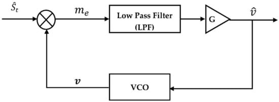 As shown in Figure 11, a PLL consists of three components: a VCO, a low pass filter (LPF), and a mixer. Here, the LPF is built with , first order, Butterworth method. The phase detector (PD) acts as a mixer to compare the phase of the received signal with the phase of the VCO. The output signal of PD represents the error voltage (), which is filtered by the loop LPF. However, this signal is amplified by the loop gain and is assumed to produce that later feeds the VCO. Subsequently, the output signal from the VCO () is multiplied by the received signal to obtain . Then, the output of the VCO is described as [,,]: