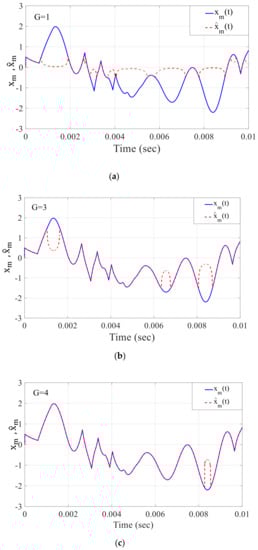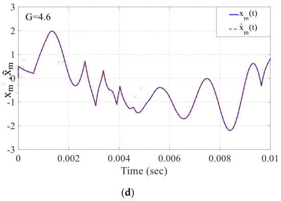 Now, the effect value of the loop gain on the recovered signal from the PLL can be seen in Figure 12a–d, where the right value must be carefully chosen for the recovered signal . As a result, it is apparent that when the loop gain value becomes 4.6, it has a significant impact on the recovering signal. The resulting signal closely resembles the original signal .