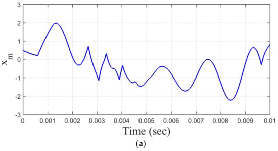Synchronization of chaotic systems is an interesting scheme and is studied in many research engineering applications. The first savant studied the synchronization between two identical systems without the same initial condition by Pecora and Carroll (PC) in 1990 []. Several control methods have been devoted to the chaotic signal in order to make the synchronization between two systems (master–slave), such as Ott et al. who, in 1990, first presented the scheme of chaos control [], sliding mode control method [], adaptive control method [], impulsive control method [], back-stepping design method [], sampled-data feedback method [], and other methods for control on synchronization of the chaotic signal []. This method and other methods have been proposed to make different chaotic systems stabilized around the unstable orbit. One example is finite-/fixed-time synchronization of memristor chaotic systems (MCSs), which are addressed via the sliding-mode control method in image encryption applications [].