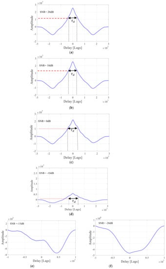 The correlation performance of monostatic continuous chaotic radar system for various SNR, (a) , (b) , (c) (d) , no signal: (e) SNR = −15 dB, (f) .