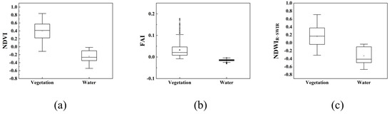 In total, the reflectance of 2000 points was obtained and calculated for the five studied lakes, i.e., 1000 points for water bodies free of vegetation cover, and 1000 for algal blooms and aquatic vegetation. A total of 80% of the points were used for modeling and 20% for validation. The three indices with the highest classification accuracy selected by SPSS decision tree classification are NDVI, FAI, and NDWIR-SWIR. Figure 2 presents the separations between vegetation and water bodies according to three indices.