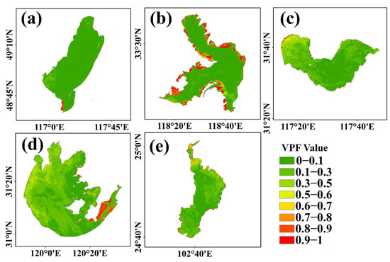 VPF values during periods with large areas of stable aquatic vegetation for (a) Lake Hulun, (b) Lake Hongze, (c) Lake Chaohu, (d) Lake Taihu, and (e) Lake Dianchi in Sentinel 2 images. The redder the area in the figure, the more frequently the vegetation signal has been present, the more probable the area is to be aquatic vegetation.