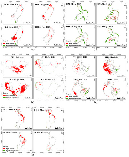 This figure shows the results of the identification of algal blooms and aquatic vegetation in the studied lakes on selected dates of algal outbreaks, using the modified VPF method. The red areas represent algal blooms, and the green areas represent aquatic vegetation; (a–e) are the identification results of Lake Hulun, Hongze, Chaohu, Taihu, and Dianchi, respectively. In the image, HLH means Lake Hulun, HZH means Lake Hongze, CH means Lake Chaohu, TH means Lake Taihu, and DC means Lake Dianchi. HLH-17 July 2019 means the image identification result of Lake Hulun on 17 July 2019. The numbers and letters following the abbreviations of the other lakes are the dates of the images.