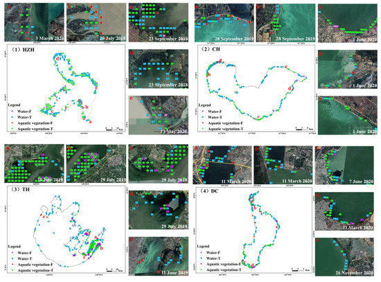 Distribution of validation points and validation results for Lake (1) Hongze, (2) Chaohu, (3) Taihu, and (4) Dianchi. Five points have been selected in different areas of each lake and their positions in the lake are marked by the letters a–e. The corresponding Google Maps images used for the verification and the results of the verification are shown in the five subimages (a–e). The date of the image used for verification can be seen in the bottom right corner of each subimage. Aquatic vegetation-T/F are points within the range of aquatic vegetation. Water-T/F are points within the buffer zone outside the range of aquatic vegetation. T is the point verified as correct. F is points verified as incorrect.