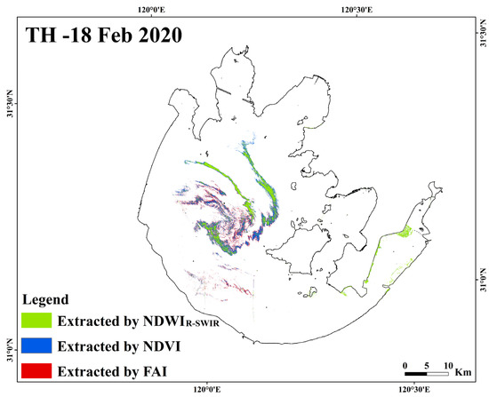 Extraction results of different indices by the decision tree for Lake Taihu on 18 February 2020. The order of decision tree extraction here is to extract first with NDWIR-SWIR, then with NDVI for the remaining part, and finally with FAI.