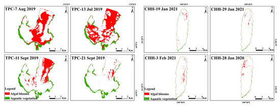 Identification results of algal blooms and aquatic vegetation in nonmodeled lakes. TPC is Taipingchi Reservoir and CHH is Lake Chenghai. TPC-7 August 2019 means the image identification result of Taipingchi Reservoir on 7 August 2019, and so on for the letter and number meanings following other lake abbreviations.