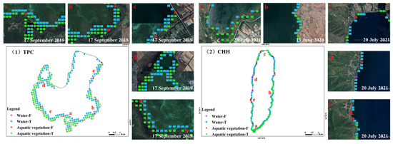 Distribution of validation points and validation results in nonmodeled Lakes, (1) TCP—Taipingchi Reservoir, (2) CHH—Lake Chenghai. Five points have been selected in different areas of each lake and their positions in the lake are marked by the letters a–e. The corresponding Google Maps images used for the verification and the results of the verification are shown in the five subimages (a–e). The date of the image used for verification can be seen in the bottom right corner of each subimages. Aquatic vegetation-T/F are points within the range of aquatic vegetation. Water-T/F are points within the buffer zone outside the range of aquatic vegetation. T is the point verified as correct. F is points verified as incorrect.