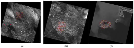 Geometric correction of the PRISMA panchromatic products was performed by considering three images (Figure 1) representing morphologically different areas, since the altimetric aspect characterizes the orthorectification process. The panchromatic images processed are 30 km × 30 km in size and include both catalogue products and new acquisitions. Table 1 shows the main characteristics of the images analysed.
