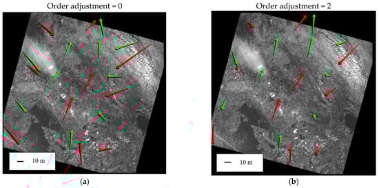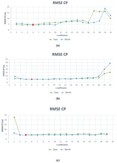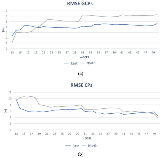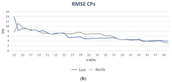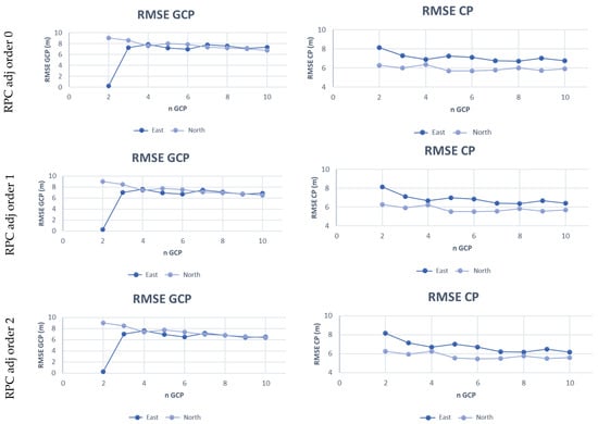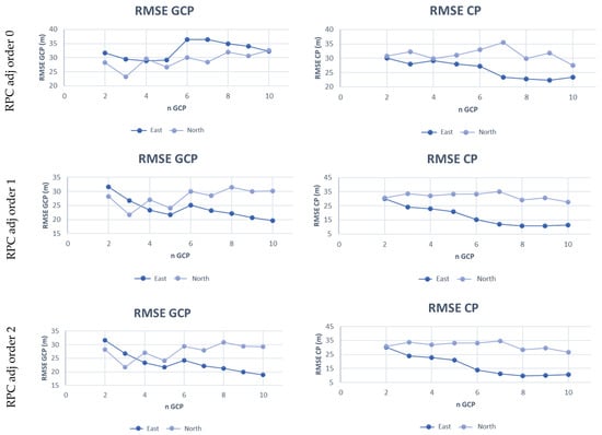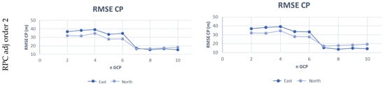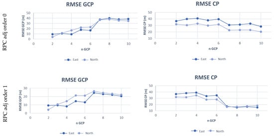 where aj, bj, cj, dj are the polynomial coefficients, I and J are the image coordinates and λ, φ, h are the corresponding object point coordinates. The RPC model is based on the RPF approach, but the coefficients are known and supplied in the imagery metadata. An RPC model with third-order polynomials, in the format RPC00B, is generally used, but the order of the terms may differ for different applications [29]. The orientation given by RPCs can be improved by estimating the parameters of a polynomial transformation on the basis of a set of GCPs; the polynomial order can vary from 0 to 2 [17]. Table 2 shows the strictly necessary GCP number for parameter estimation, but in our elaboration, several redundancy conditions have been achieved to reduce the risk of errors due to outliers or a strong dependence on the chosen GCPs.