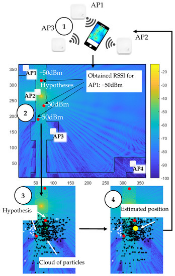 To determine the location of the terminal, a modified version of a particle filter algorithm [30,33,34] was used.