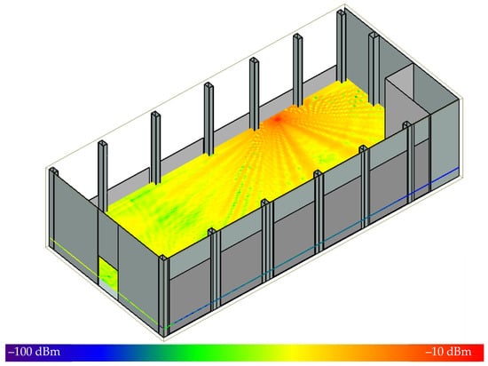 The multiwall model was generated using the WiCa Heuristic Indoor Propagation Prediction Tool (WHIPP) [40]. The model included walls, doors, windows, and electromagnetic (EM) parameters that can also be used to create signal propagation distribution data. The tool used to calculate the EM field distribution utilizes a multiwall propagation model, and includes information on such obstacles as walls and ceilings.