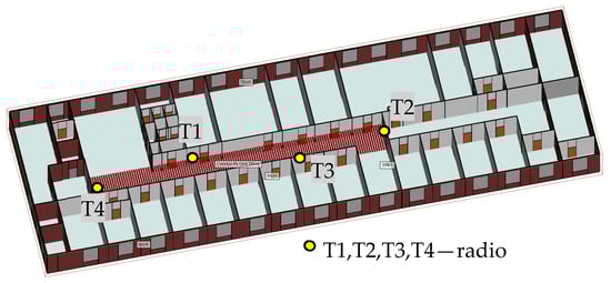 To verify subsequent test cases, the movement of the user in the building was simulated along a designated straight path. In the first scenario (S1), a route was planned along a corridor at the Institute of Electronics, Lodz University of Technology. In the second scenario (S2), the path was a straight line through the middle of a sports hall, “Sports Bay” at Lodz University of Technology. The third scenario (S3) was a simulated model, where the path was along a straight part of a corridor where T1, T2, and T3 transmitters were located, as depicted in Figure 10.